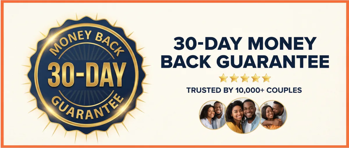 Here's the truth: most couples spend more time arguing about money in a single month than it takes to set up the Couple Money OS™. We've designed this system to work in one evening — 60 minutes or less — and the results speak for themselves. But if for any reason it doesn't work for you, you're fully protected. You have a full 30 days to go through everything, implement it with your partner, and decide if it's right for you.