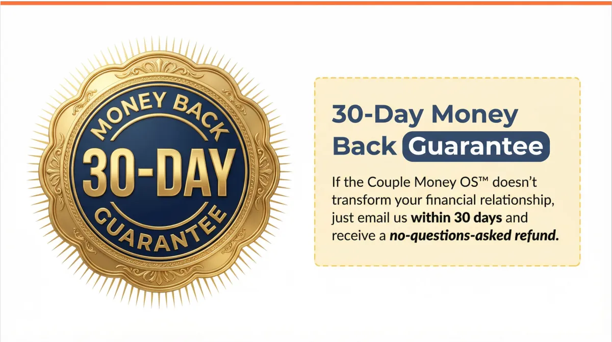 We know that taking a step toward financial harmony as a couple requires trust — and we don't take that lightly. That's why every purchase of the Couple Money OS™ is backed by our 30-Day Financial Harmony Guarantee. If you go through the system and don't feel closer, more aligned, and more in control of your money together, simply email us within 30 days and we'll refund every penny. No questions asked. No hoops to jump through.