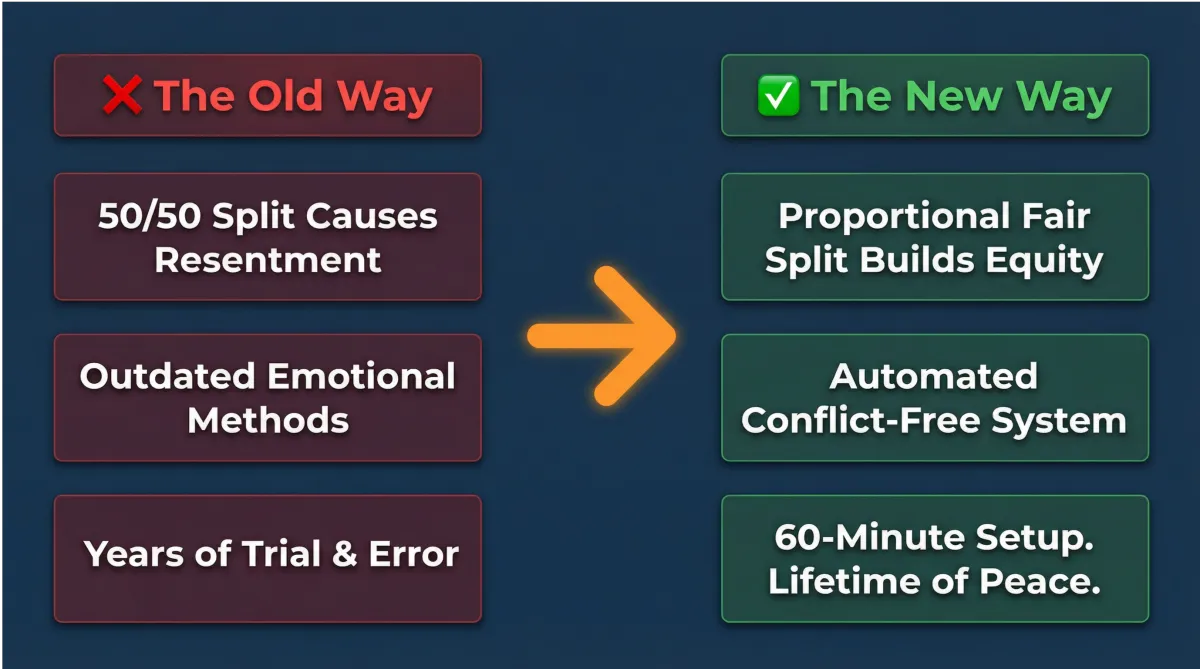 A: That's exactly why we created The Fair Split & Contribution Calculator™! This powerful tool helps you instantly calculate an equitable split that feels perfectly fair to both partners, regardless of income differences. It's designed to remove all guesswork and potential for resentment.